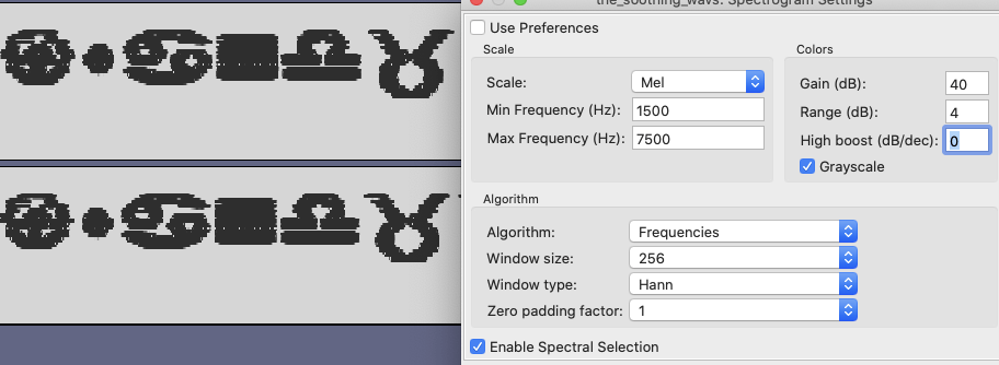 I open up the Spectrogram Settings panel and start playing with the values until I get something a bit easier to read: