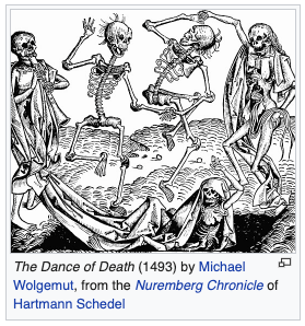 As always, I go through my stego checklist (file, strings, binwalk, steghide) and sure enough, steghide gets blocked by a required passphrase. That last sentence in the hint probably means that I need to research the picture. I quickly google “dance of death” and open up the Wikipedia page.