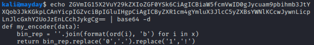 There really isn’t much to see here so let’s focus on the data that was posted by the user. It’s composed of “data”, a series of periods and exclamation points, and “encoder” which is probably base64 encoded given that there are 2 equal (=) signs at the end of the string. The data part looks like it could be Morse code or binary, since there are only 2 different types of characters. I want to check out that base64-looking text too.