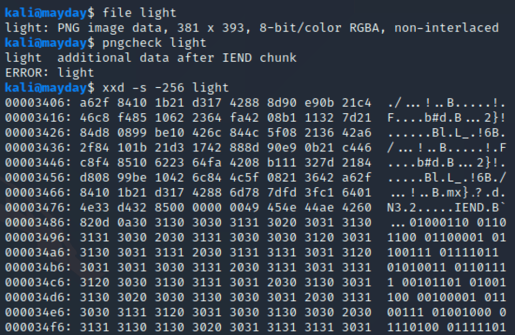 I start my recon as always by file, and finding out that it could be a PNG, I run pngcheck as well, which warns me that there is an error in the file footer. I check out the last 256 bytes of the file using xxd and sure enough there are binary strings after the IEND which should close all PNG files.