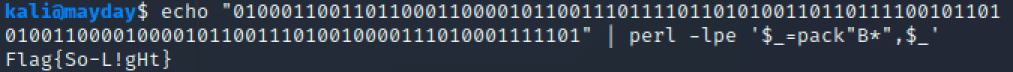 Now that we have the binary text, we have lots of solutions to convert it to ascii such as pasting it in Cyberchef, using Python or Perl. Let’s use Perl for once: