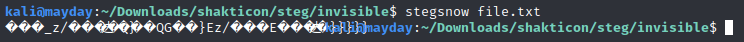 Then I remember a technique called snow. This steganography technique uses spaces and tabs to encode text inside text files so that the message seems invisible to the human eye. One popular piece of software used to encode and decode snow messages is called stegsnow. Let’s try it out: