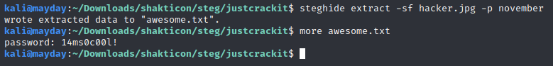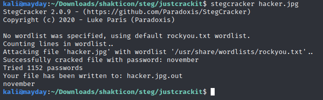 This time, after only a few seconds, the passphrase for hacker.jpg pops out: november
