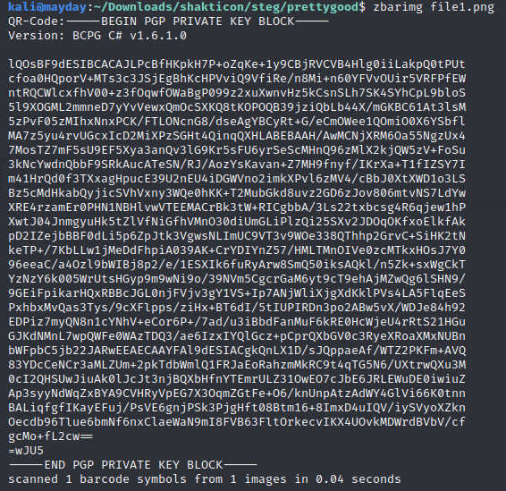 This is interesting! The QR code contains a PGP Private Key. This means that we should try to find a PGP Message and a passphrase somewhere hidden inside this same image or the second image.