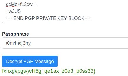 We now have all we need to decode the flag! I head to https://8gwifi.org/pgpencdec.jsp and input the PGP Message, PGP Private Key, and passphrase. Crossing fingers for that passphrase to be the good one! Here’s the result: