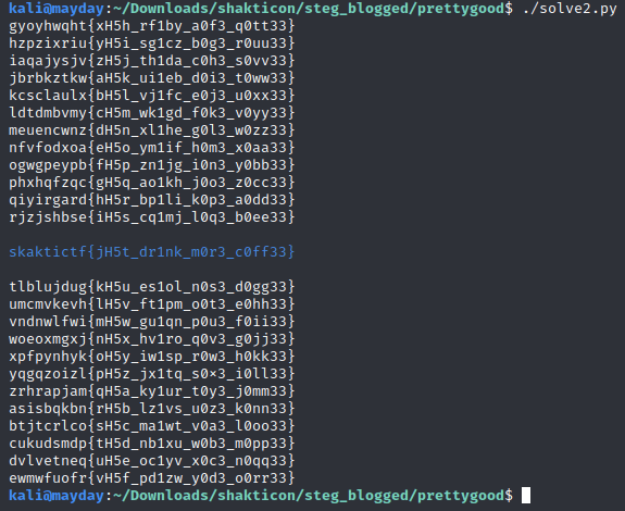 There’s our flag! But wait a minute… that’s not the right format, it’s supposed to start with shaktictf{. Let’s see if we can solve this with a simple character rotation (Caesar cipher or shift cipher). I write a quick python script to rotate a string 25 times so that I can see all rotation possibilities:
