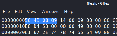 As we can see here, we have 50 4B 08 09 instead of 50 4B 03 04, so let’s correct this and see if we can unzip it after saving the corrected file: