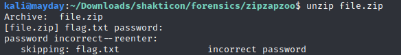 I know it’s presented as a ZIP file, but I still always start my recon on a file with the file and TRiD commands just to make sure. This appears to be a valid zip archive, let’s unzip it. Unzipping it reveals another zip file called file.zip this time. After checking that it’s a legitimate ZIP file, I unzip it. But there’s a snag!
