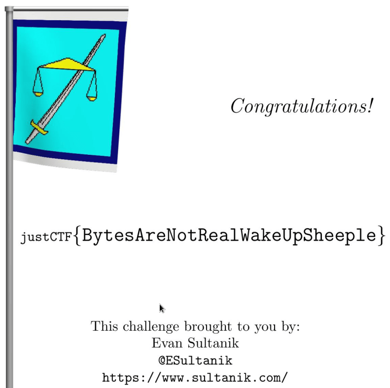 This PDF contains the flag, but you’ll probably need to fix it first to figure out how it’s embedded. Fortunately, the file contains everything you need to render it. Follow the clues to find the flag, and hopefully learn something about the PDF format in the process.