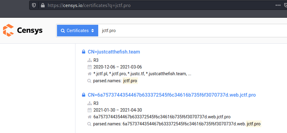 As we started working on this challenge, we looked for subdomains for justctf.team which was the domain hosting the ctf site. But we couldn’t find anything interesting there. Continuing our enumeration of domains, we found the jctf.pro domain that was used for a few challenges. Bingo!