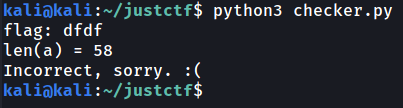 Now we know that the flag is 57 characters long (len(a) = len(xs) + 1). This probably includes the 9 characters justCTF{}.