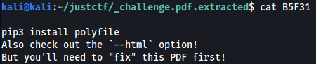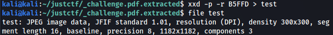 This image contains a few tips that I didn’t understand at that time. One of them being that the PDF specifications allow for 6 kinds of “space” characters and a 7th one has been added here in this modified version of mutool: ACK 0x06. Anyway, as I had explored all the tips and was in a dead end, I decided to examine all the files that had been extracted by binwalk. One of them reveals more hints!